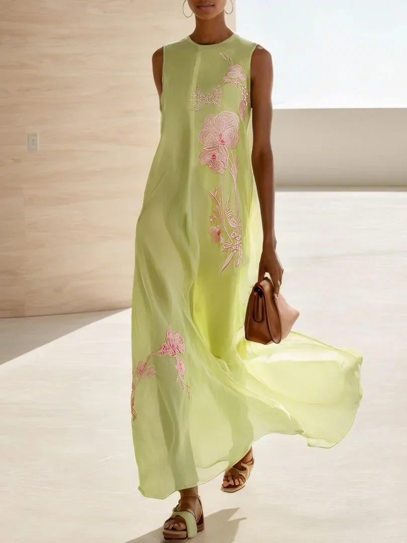Yellow Embroidery Classic Lyocell Crew Neck Sleeveless A-Line Maxi Dress