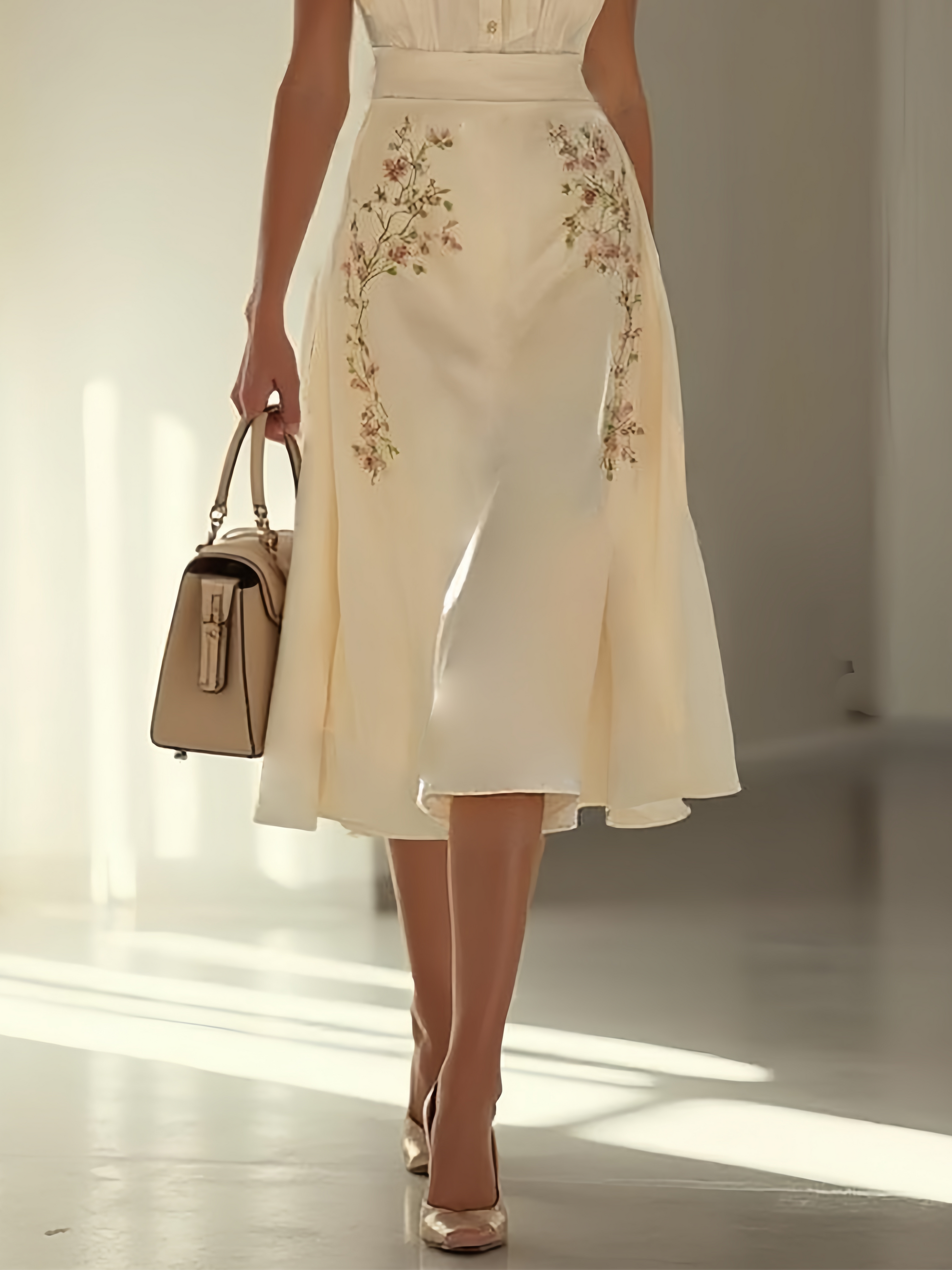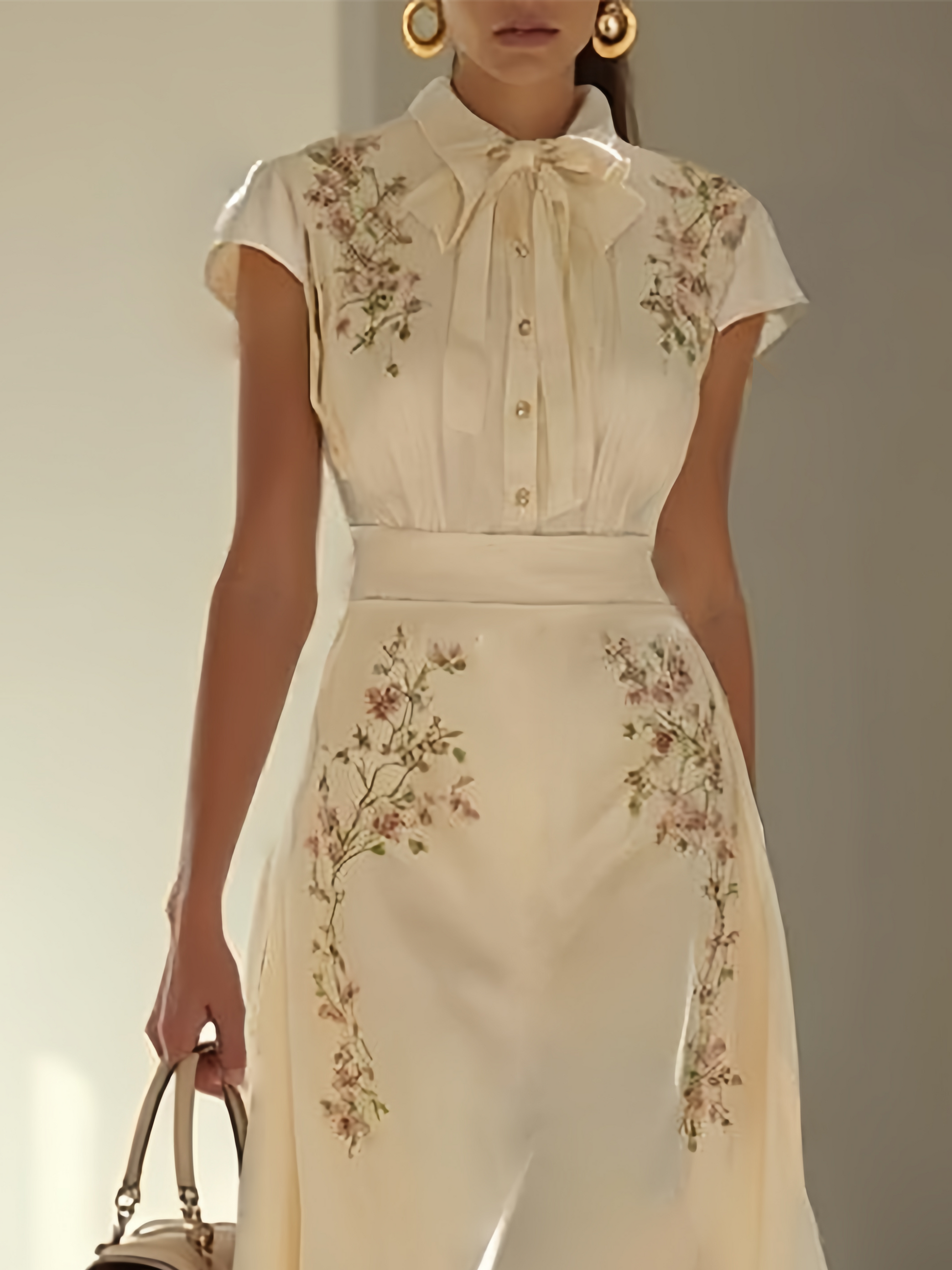 Apricot Embroidery Floral Classic Bow Collar Cap Sleeve A-Line Midi Dress