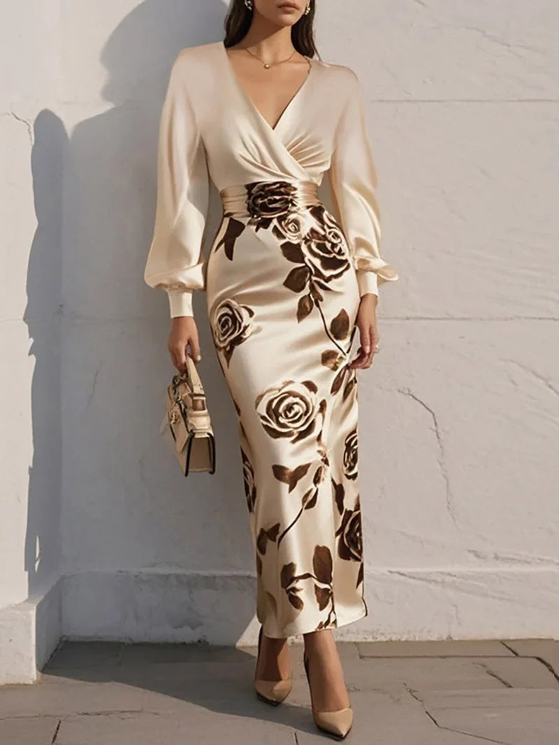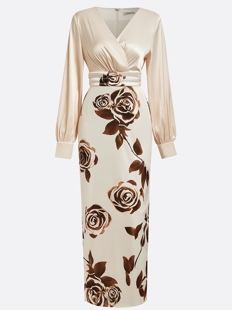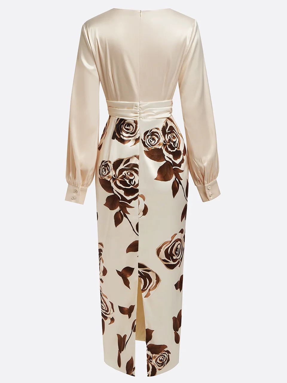 Apricot Floral V Neck Long Puff Sleeve Satin Sheath Maxi Satin Dress