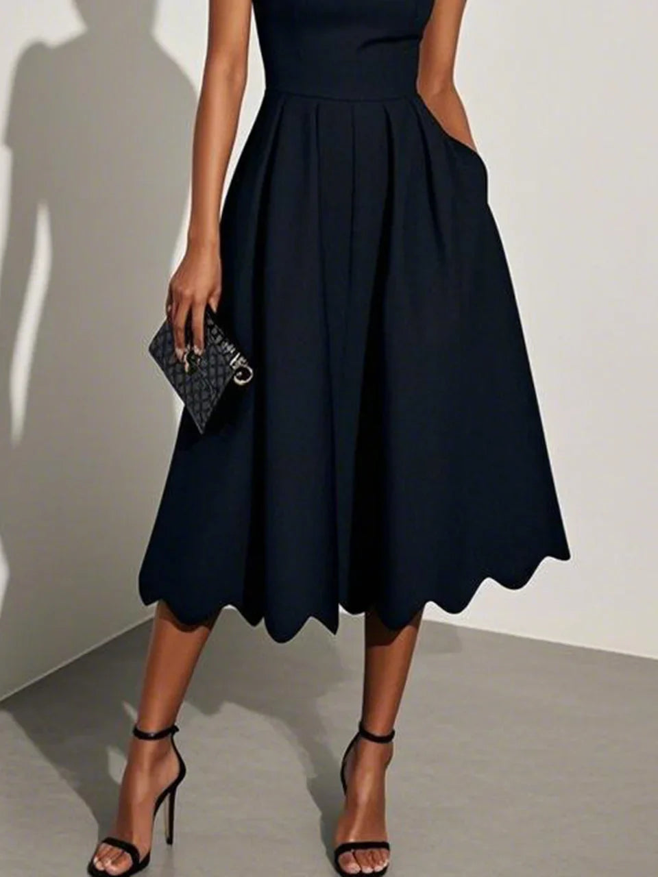 Black Asymmetric Classic Scalloped Square Neck Short Sleeve A-Line Midi Dress