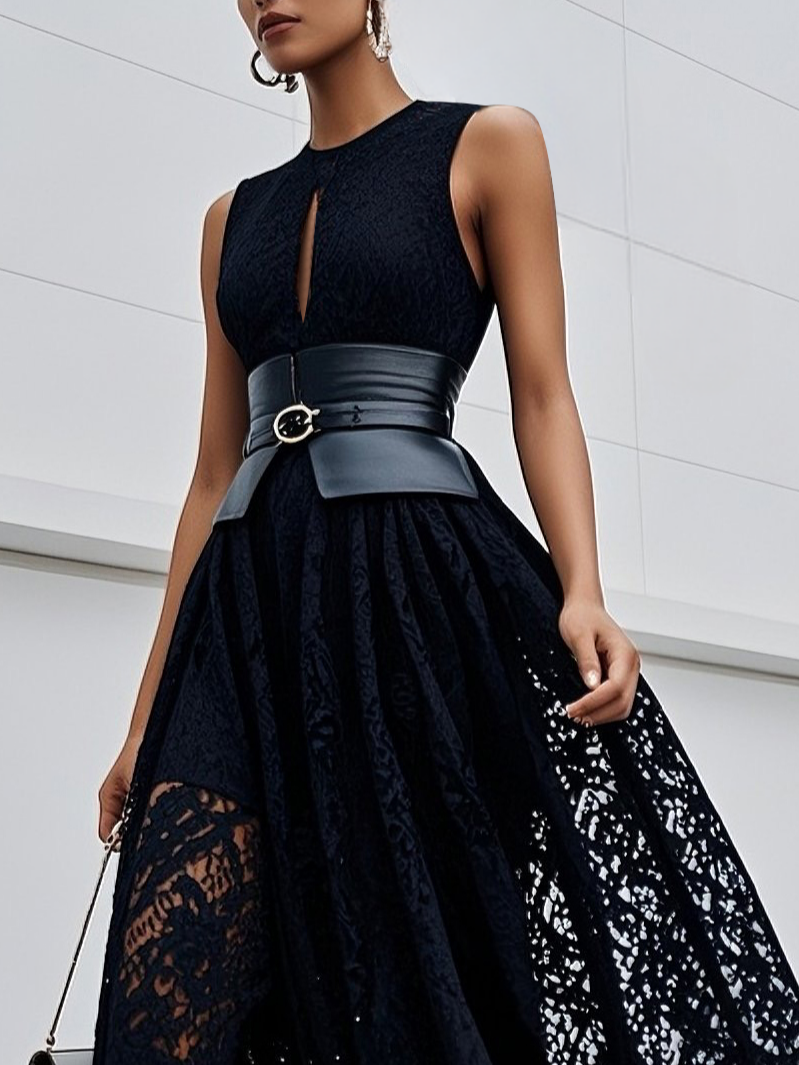 Black Lace Hollow Out Cotton Crew Neck Sleeveless A-Line Maxi Dress With Belt
