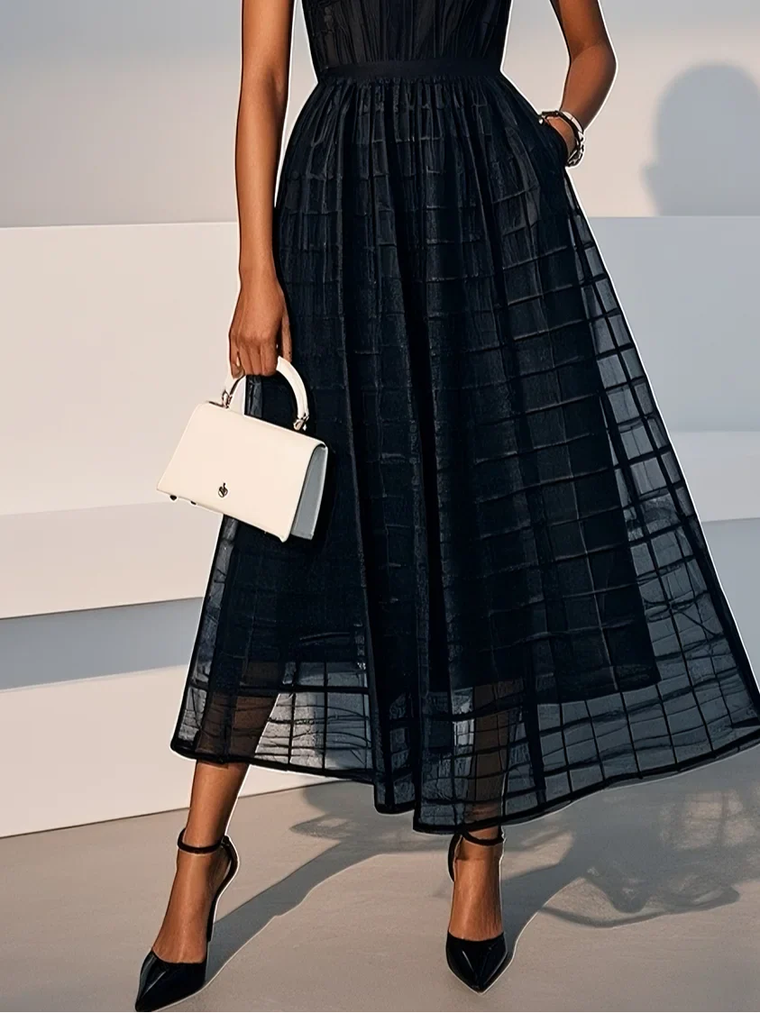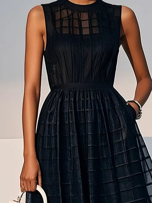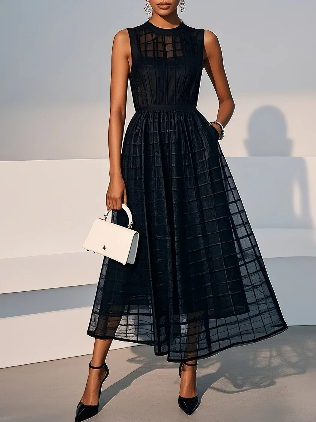Black Organza Mesh Plaid Classic Crew Neck Sleeveless A-Line Midi Dress
