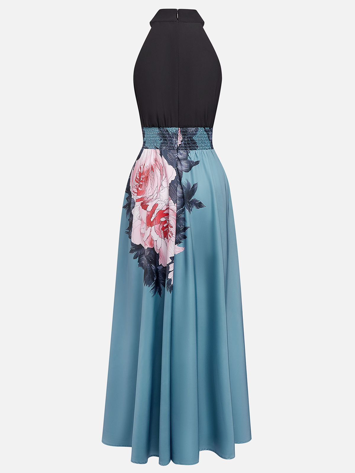 Black Slit Floral Satin Halter Sleeveless A-Line Maxi Dress