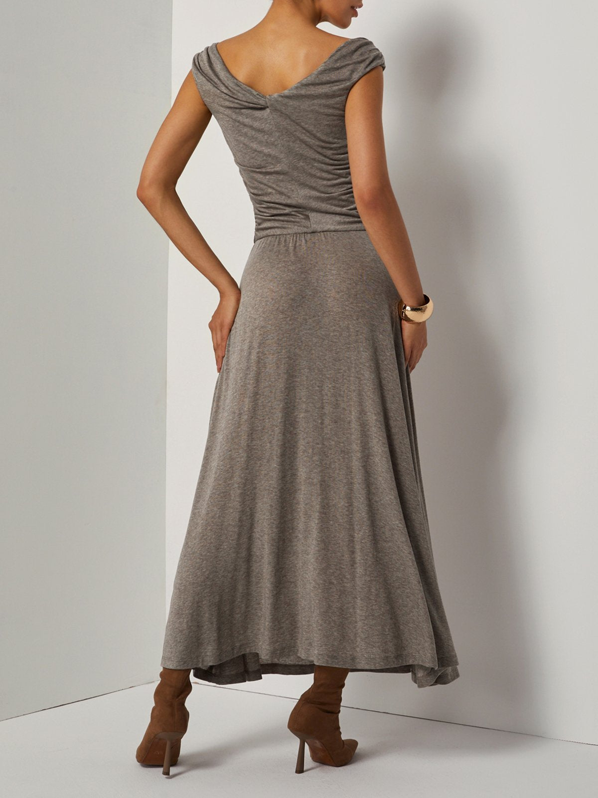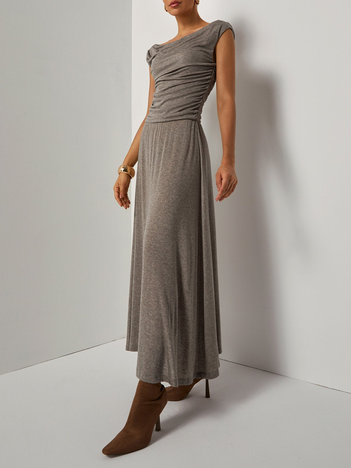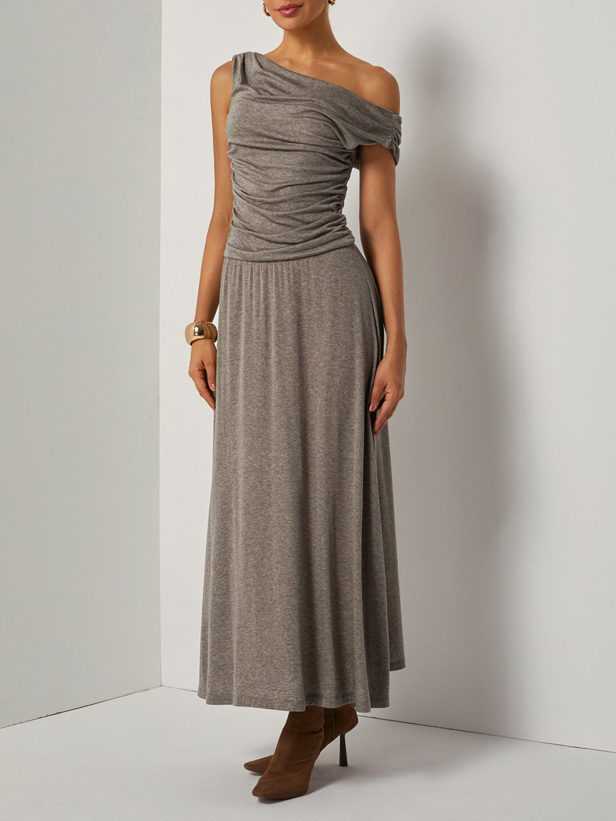 Khaki Lyocell Wool Ruched Knit Off The Shoulder Sleeveless A-Line Maxi Dress