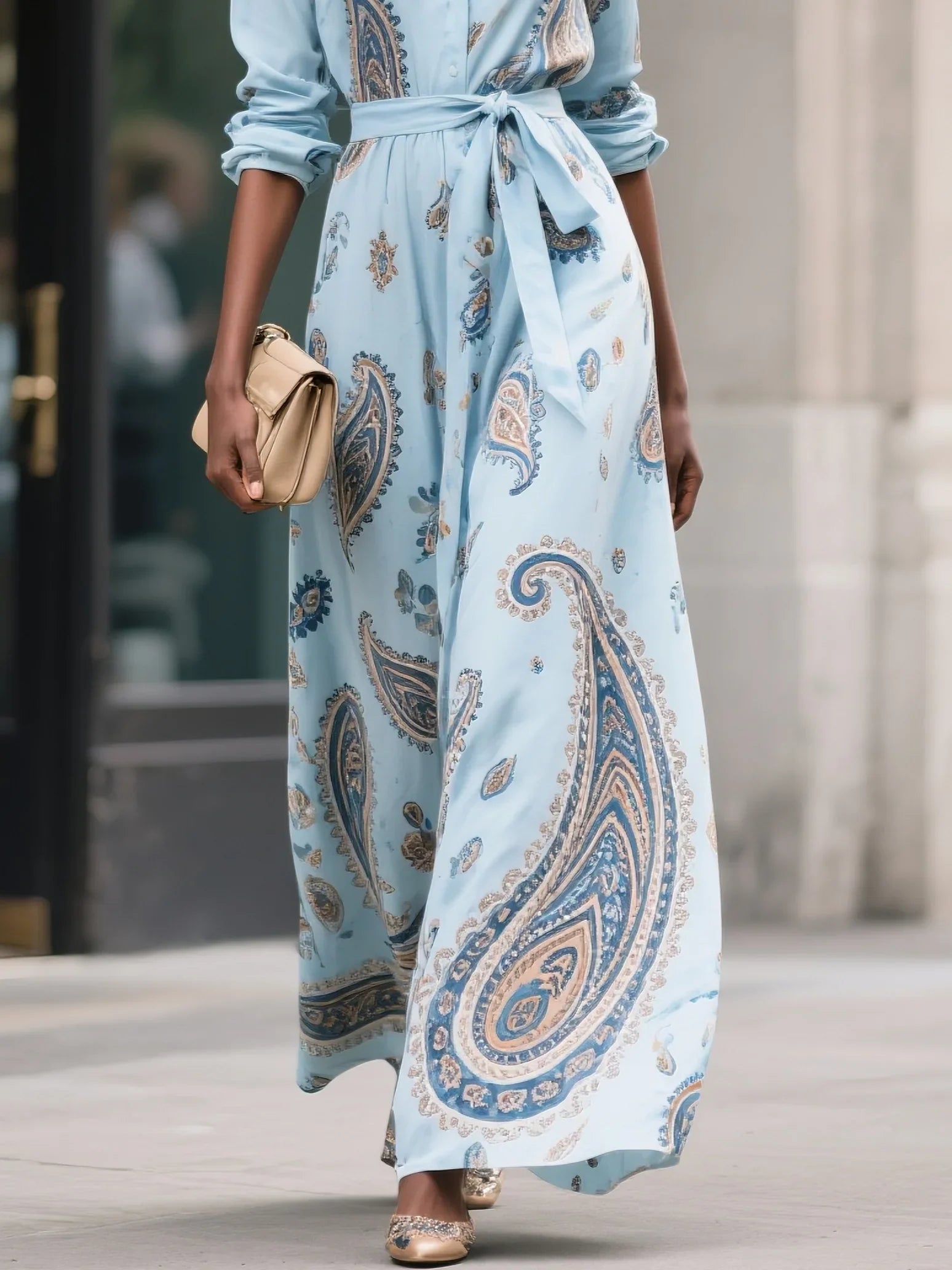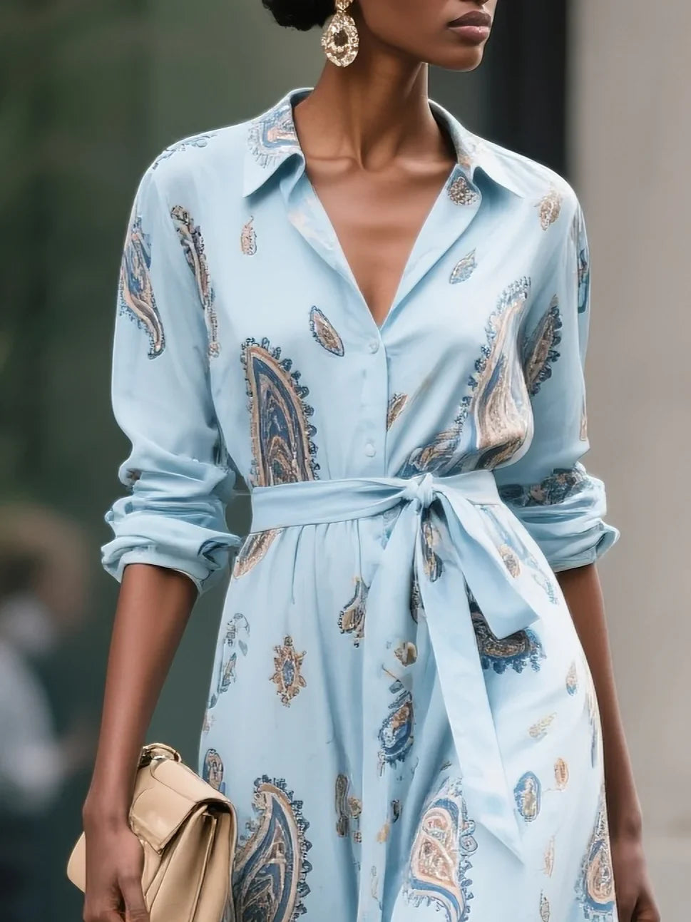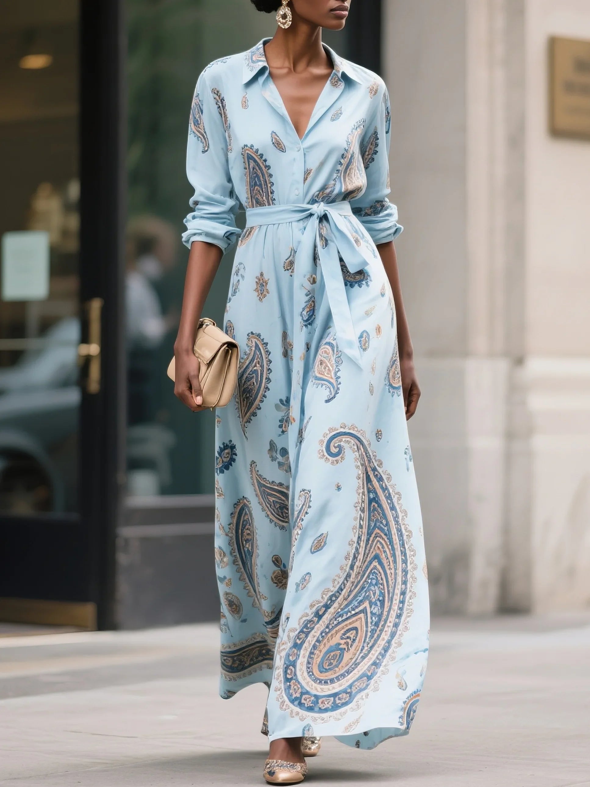 Light Blue Floral Paisley Cotton Shirt Dress Shirt Collar Long Sleeve A-Line Maxi Dress