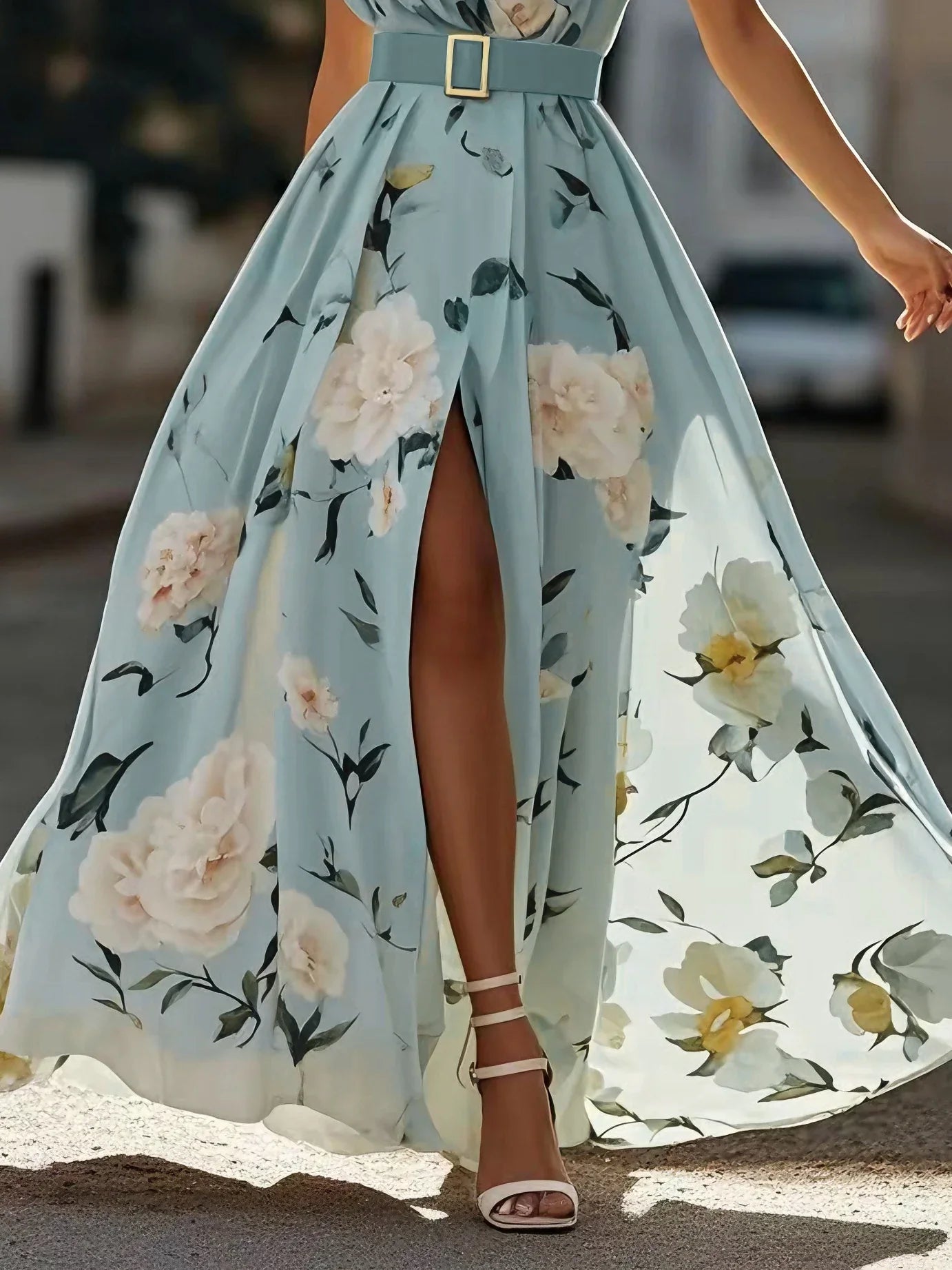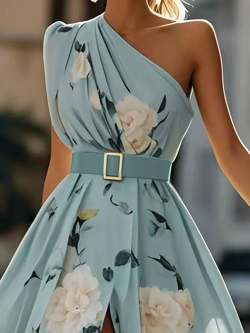 Light Blue Floral Ruched One Shoulder A-Line Maxi Chiffon Dress