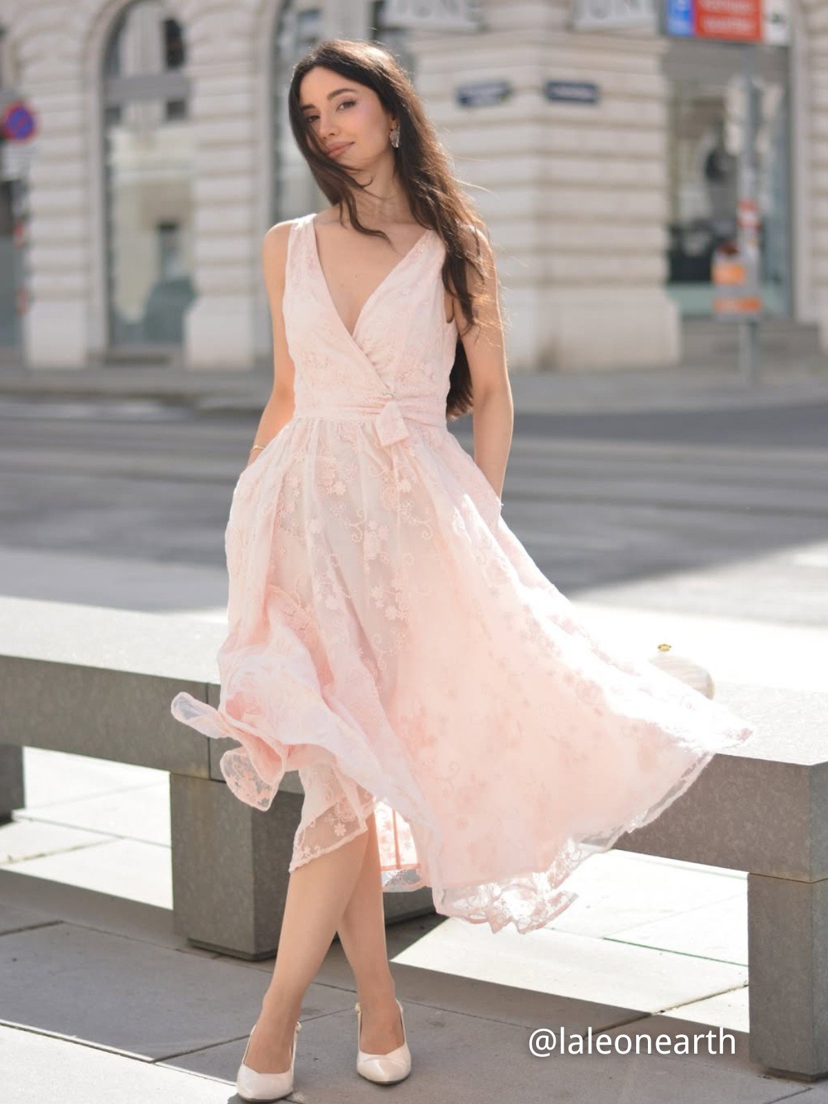 Light Pink Bow Embroidery Classic V Neck Sleeveless A-Line Midi Dress