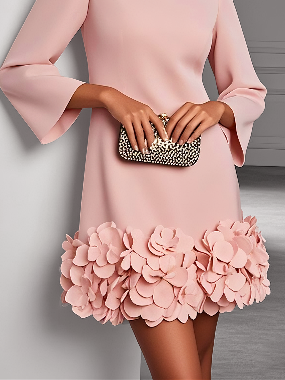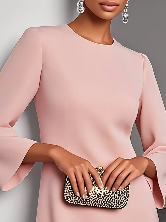 Pink 3D Floral Classic Crew Neck Long Sleeve Shift Mini Dress