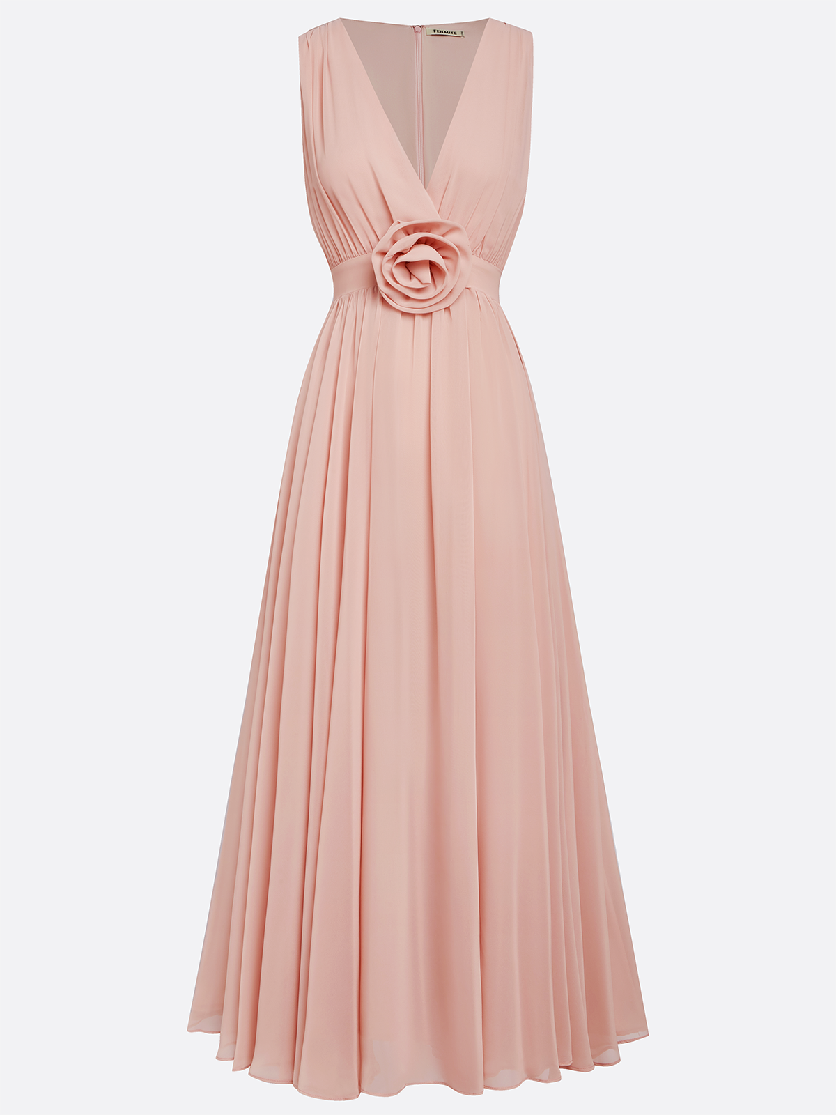 Pink 3D Floral Pleated Chiffon V Neck Sleeveless A-Line Maxi Dress