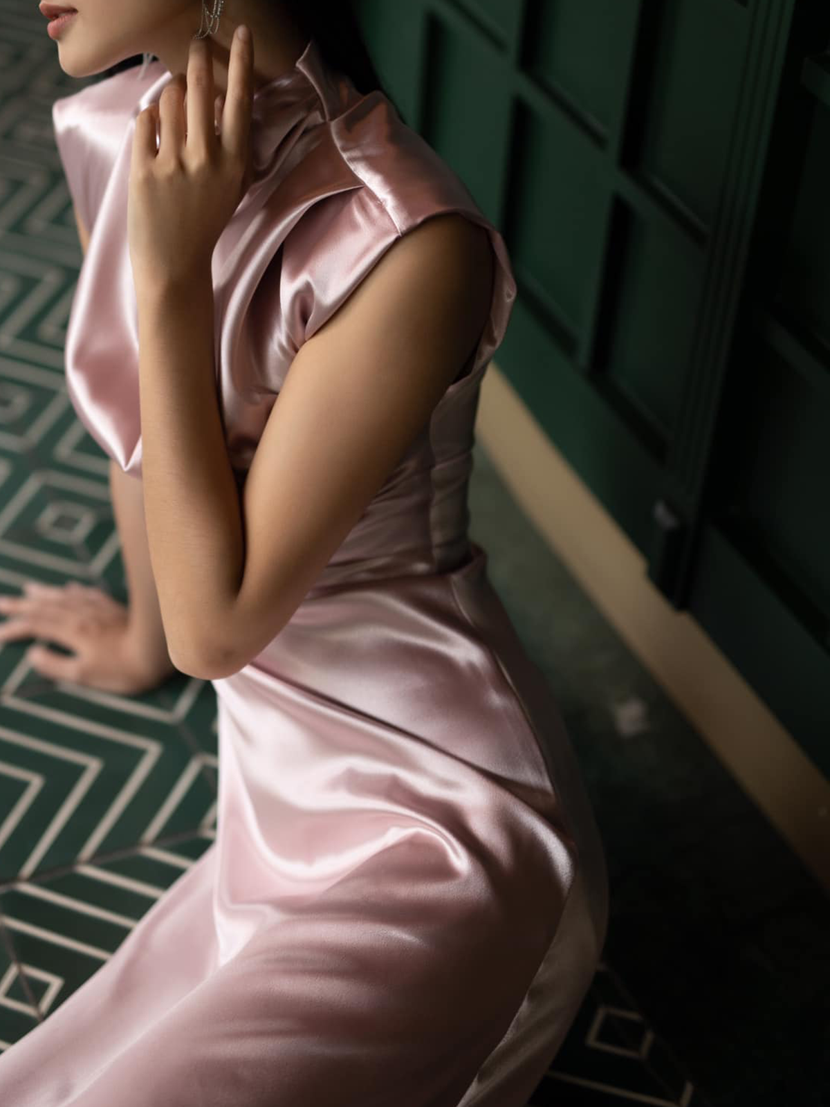 Pink High Neck Satin Sleeveless A-Line Midi Dress