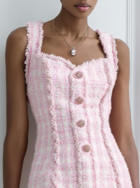 Pink Webbing Buckle Tweed Spaghetti Sleeveless A-Line Mini Dress