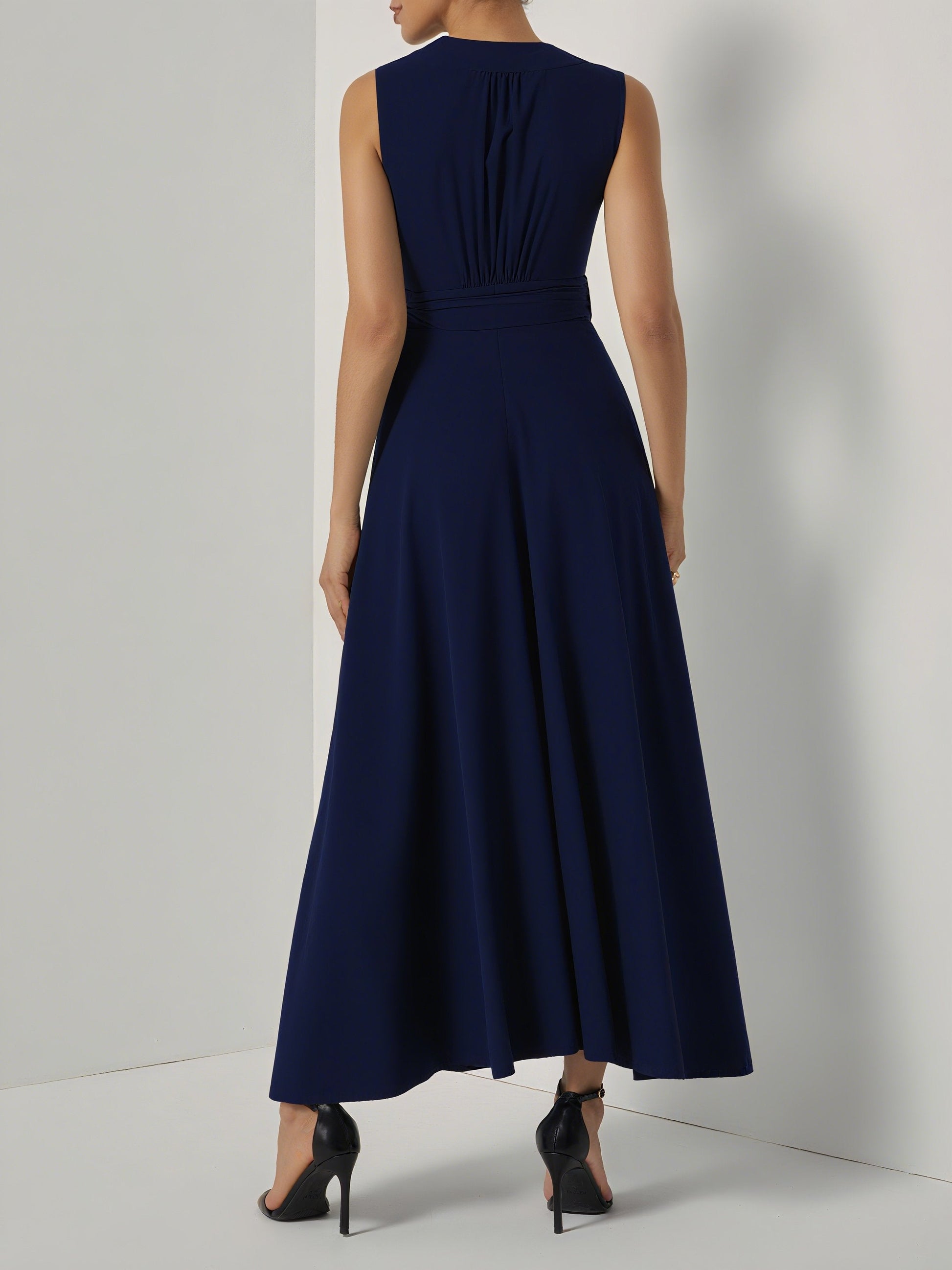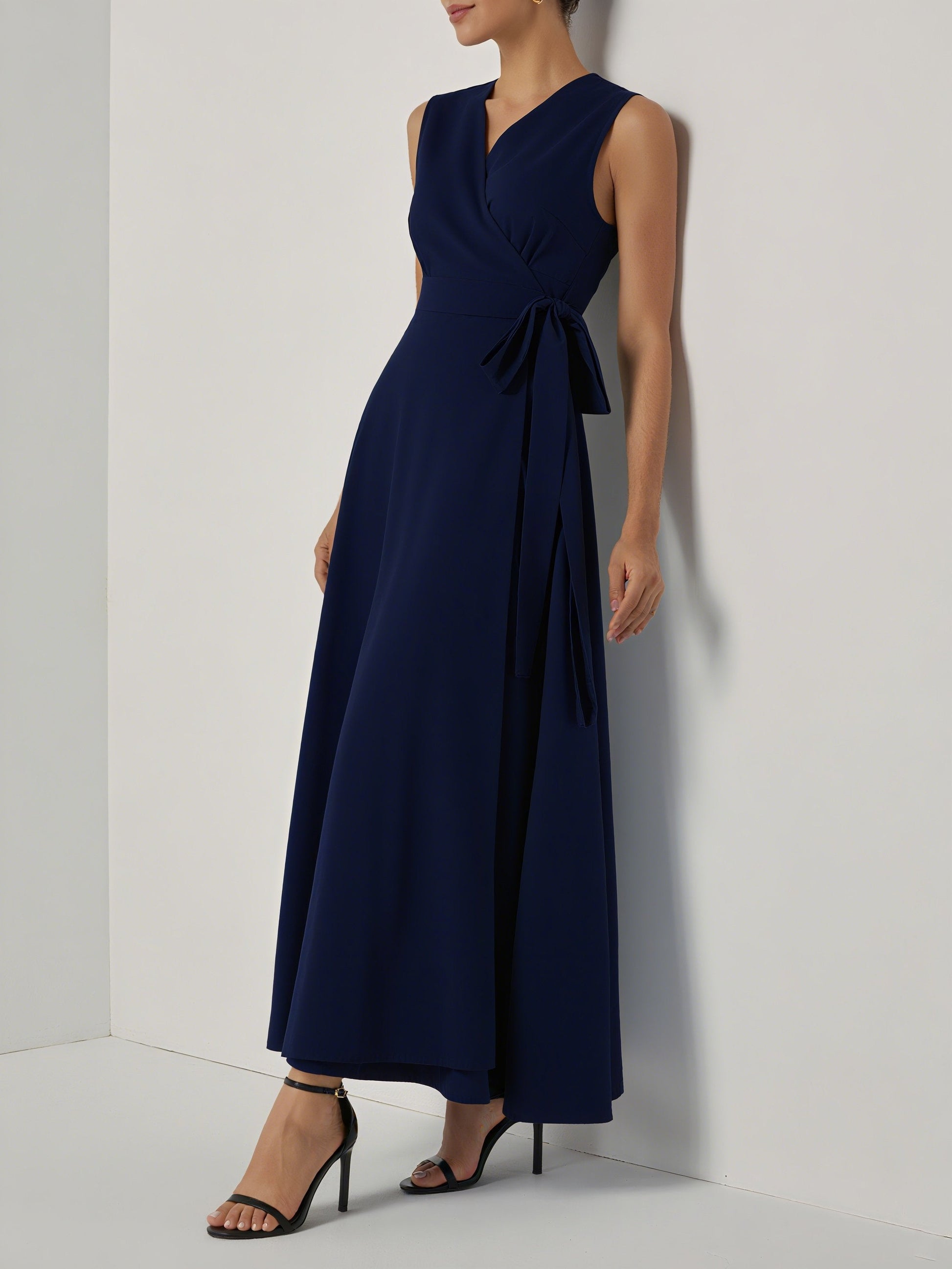 Purplish Blue Bow Lyocell Linen Wrap V Neck Sleeveless A-Line Maxi Dress