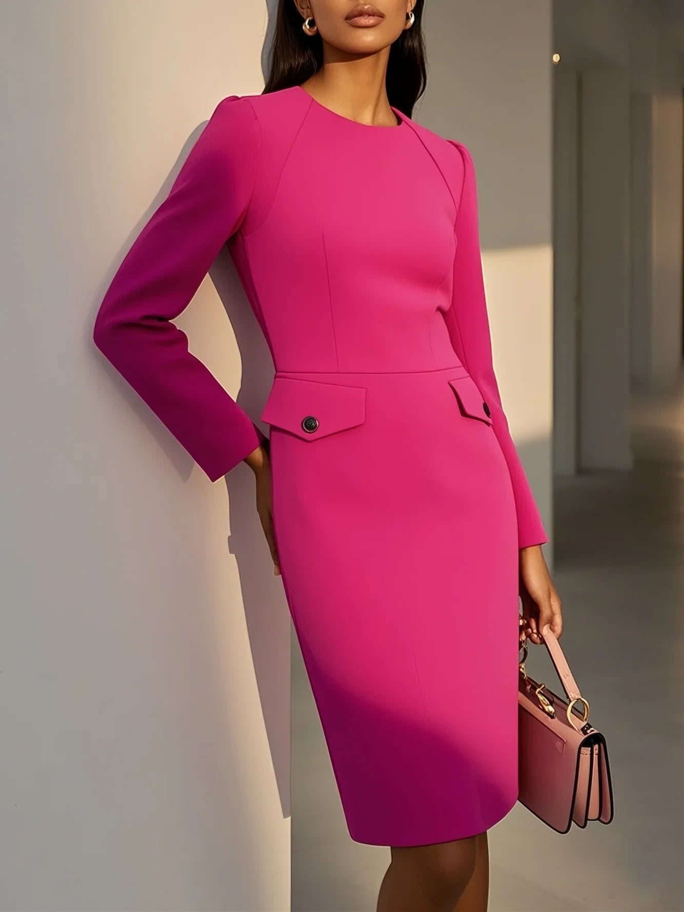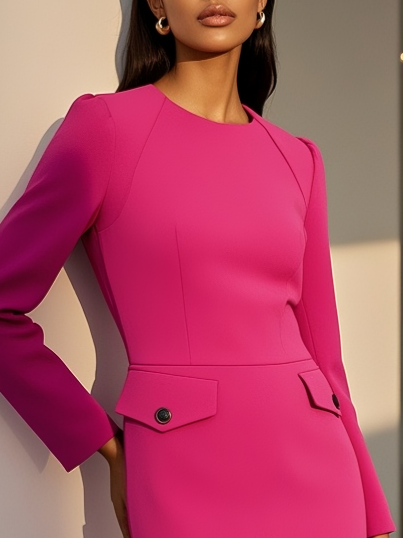 Rose Red Buckle Classic Crew Neck Long Sleeve Sheath Mini Dress