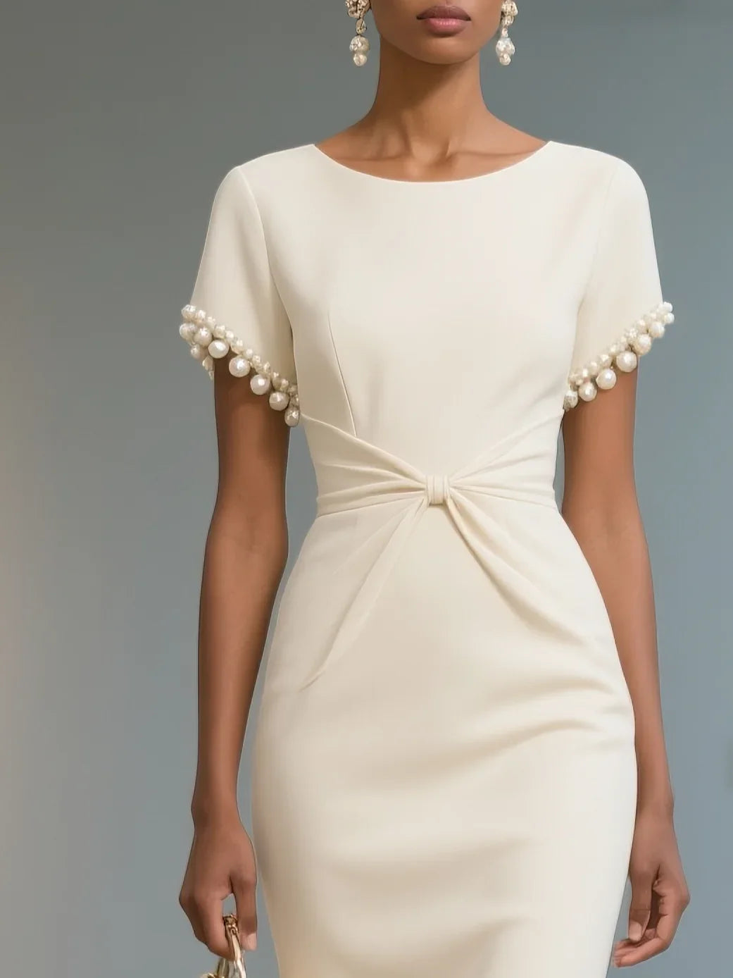White Imitation Pearls Knot Front Classic Boat Neck Short Sleeve Sheath Midi Dress