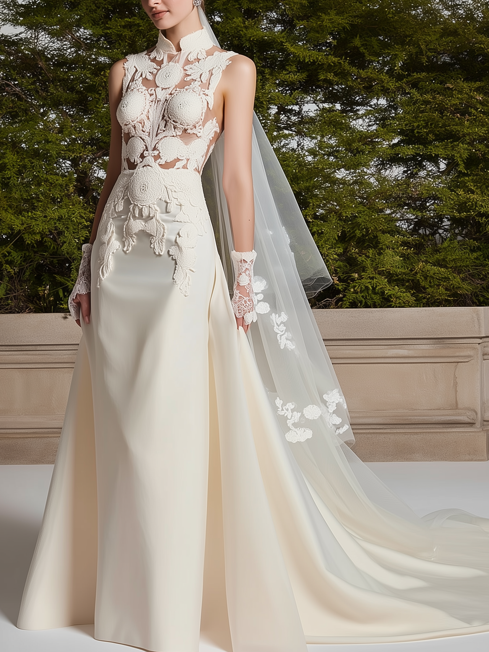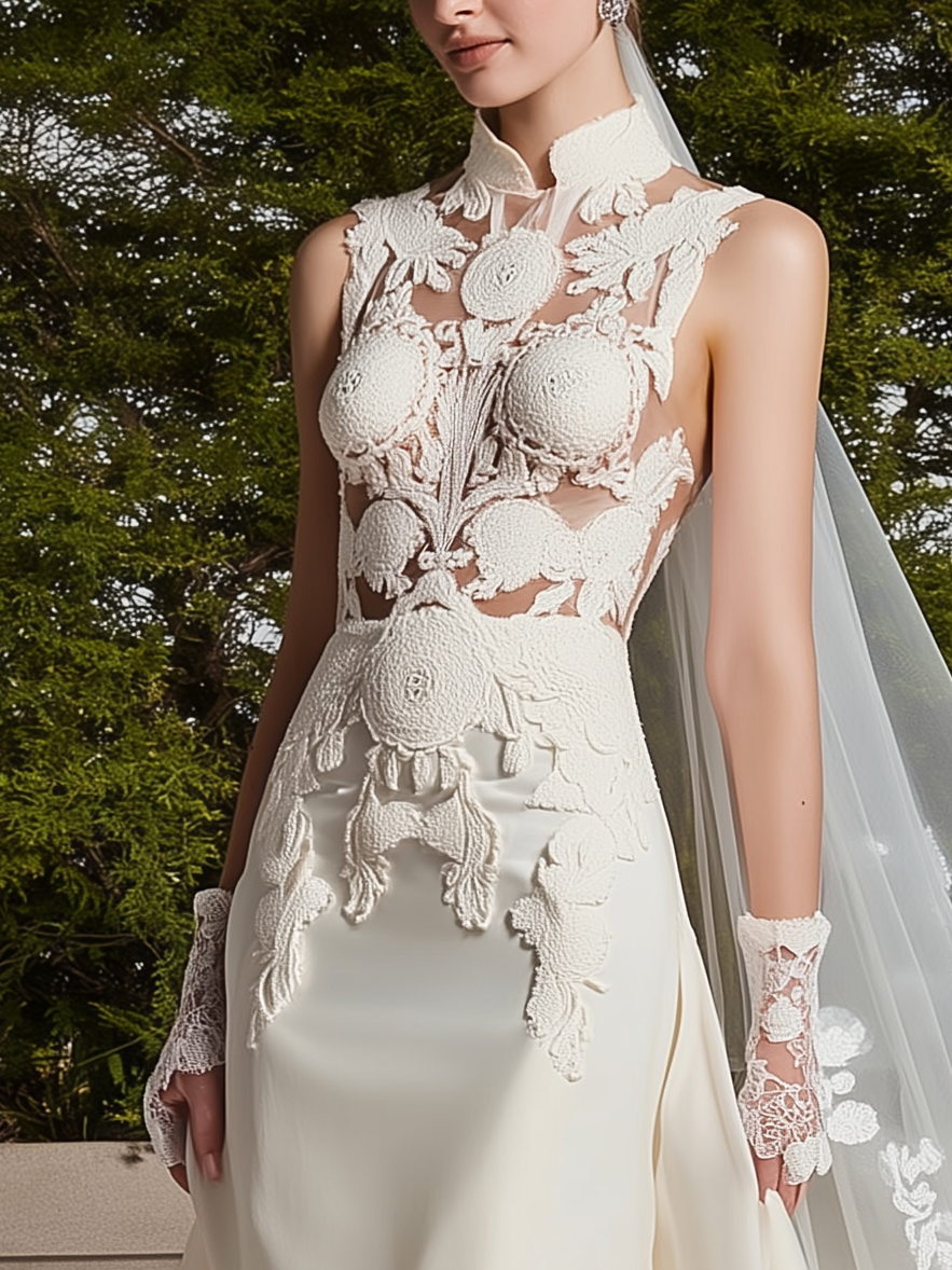 White Lace Hollow Out Bridal/Wedding Dress Stand Collar Sleeveless Sheath Gown Dress