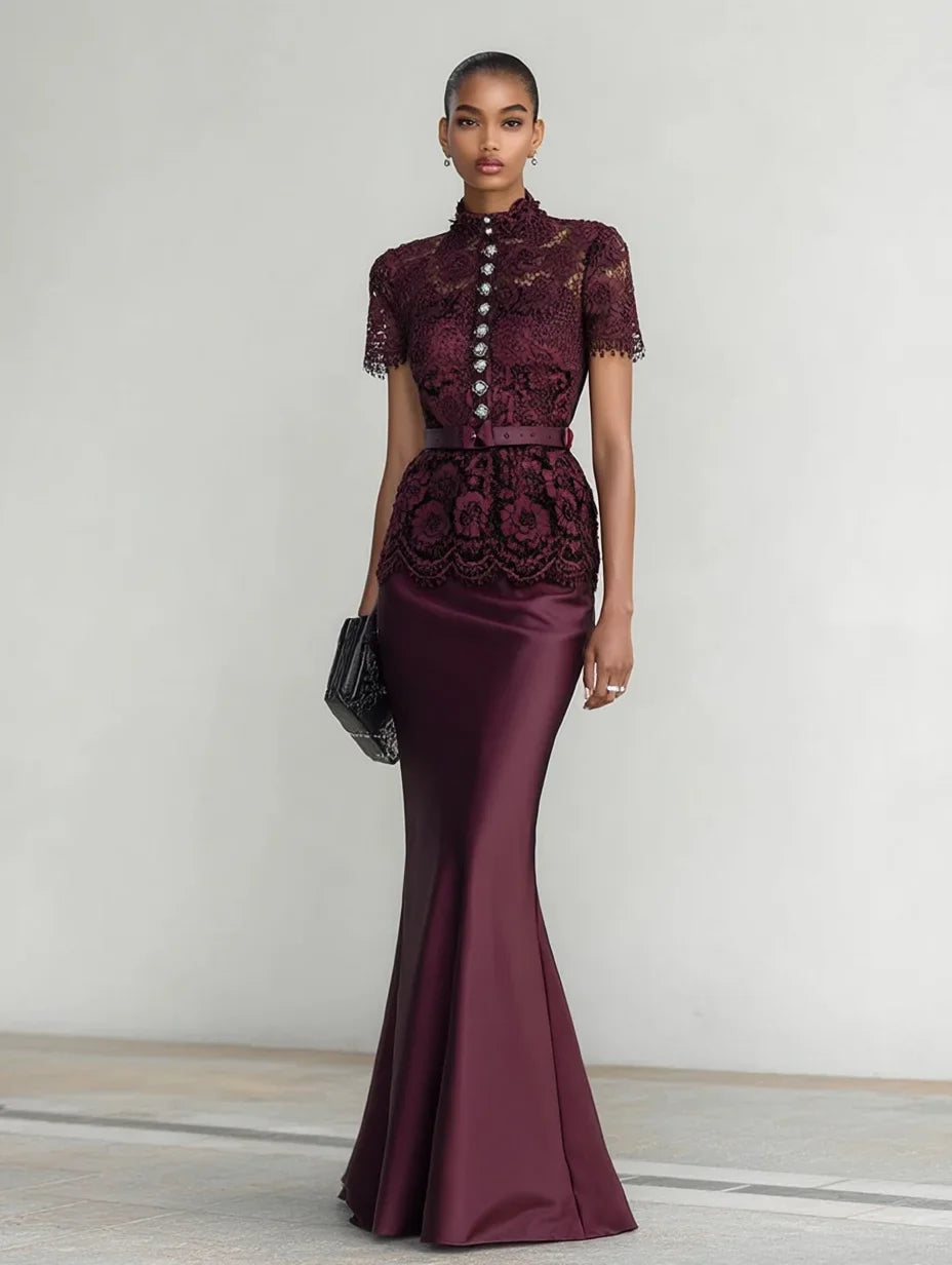 Wine Red Buckle Lace Classic Mock Neck Short Sleeve Mermaid Maxi Dress