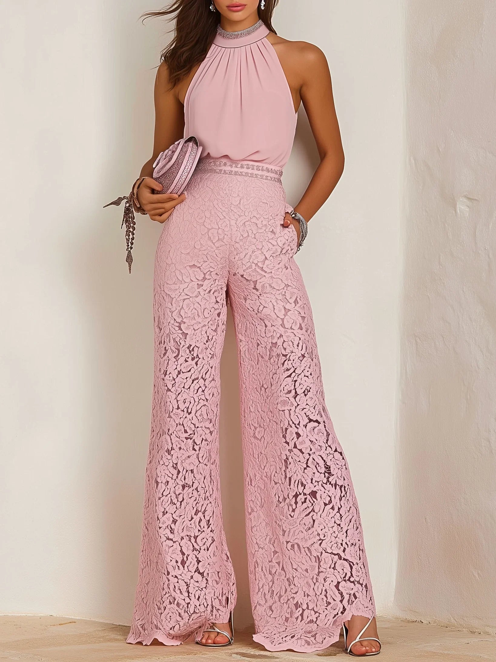 Women Pink Lace Rhinestone Mock Neck Sleeveless Dressy Jumpsuit