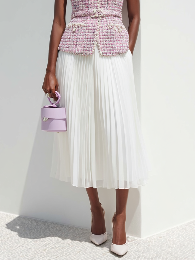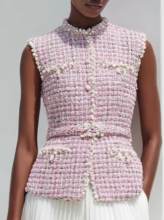 Women Pink Tweed Buckle Stitching Lace Crew Neck Sleeveless Dressy Coat With Skirt Two-Piece Set